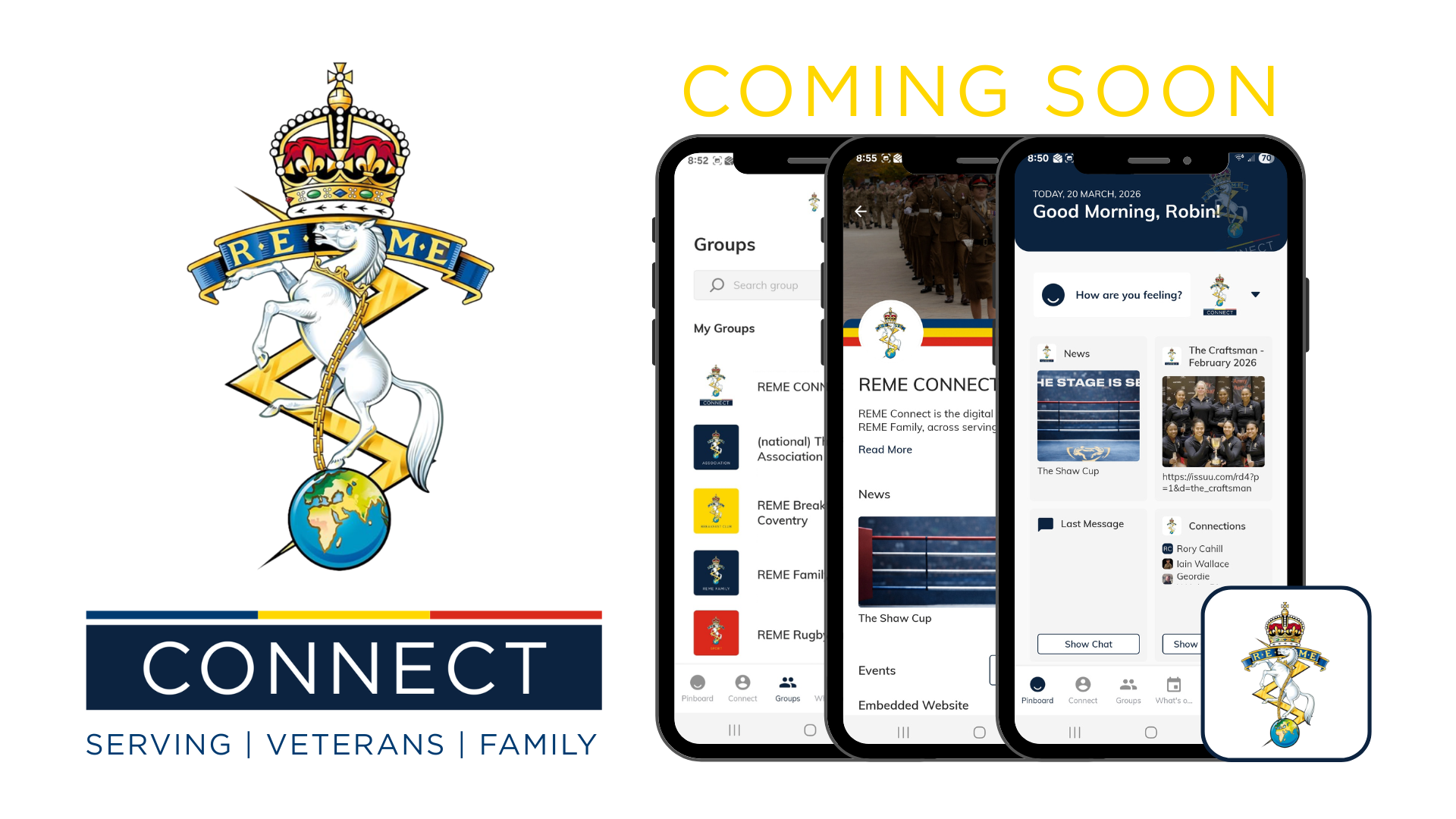 REME Connect is a digital community platform for Serving Personnel, Veterans and Partners & Families. It will transform the way we can communicate, connect and engage across the entire Regimental Family and our antecedent Regiments, with peer support and in-person connection at its heart. The app will be available to download in the App Store & Google Play Store by searching "REME Connect", as well as accessible by website access from your home computer, laptop or tablet (MODnet approved).